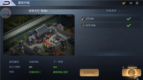 7、点击升级,官府大厅的升级属性也会随之加强,不同的建筑属性各不相同;