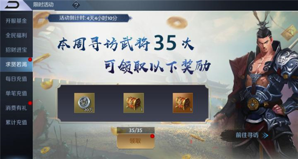 并且还有许多的活动可获得武将或武将碎片,比如:签到、七日目标、限时活动—求贤若渴、各充值活动等等