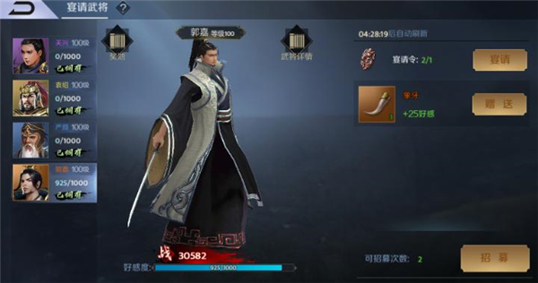 宴请是酒馆招募的一种高级方式,会有小概率刷出赵云、郭嘉、董卓等稀有橙将。因为酒馆会每隔一段时间自动刷新武将列表,所以最好是准备好足够的丹炉、水晶、夜明珠、象牙这四种增加武将好感度的物品,然后再使用宴请令刷新酒馆人物,一旦刷新出稀有武将立刻增加好感度招募。