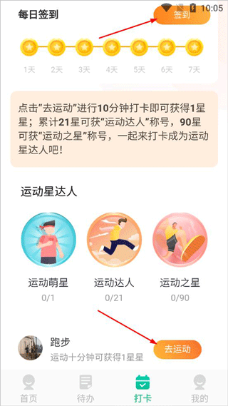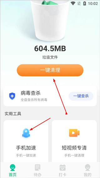 1、免费清理专家软件,有首页、待办、打卡和我的,首页可以一键清理垃圾,还能病毒查杀、手机加速等;