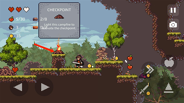 3、和游戏NPC完成对话后继续往前,右下角的【三角形】图标为跳跃键,尝试跳跃去接取图中的苹果,