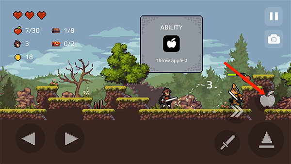 6、左上角为角色的属性栏,包括生命值、苹果数、宝箱数、金币数等,点击右边的【苹果】图标,可使用苹果攻击敌人,同时也会消耗苹果数,需要合理使用,