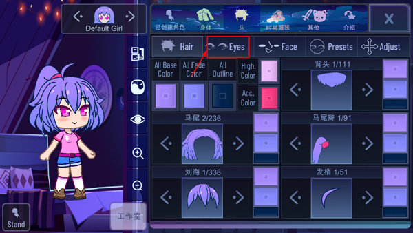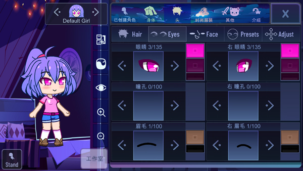 游戏中支持将打扮好的角色截图保存为16:9比例的壁纸,非常适合喜欢二次元风格的玩家。如果你想调中文或调整眼睛,也很简单:调中文的话,打开游戏后点击左下角language,选简体中文就能完成;调眼睛的话,在主菜单点击“头”再选“Eyes”,就可以调整角色的眼睛、瞳孔和眉毛,还能隐藏图标查看效果。