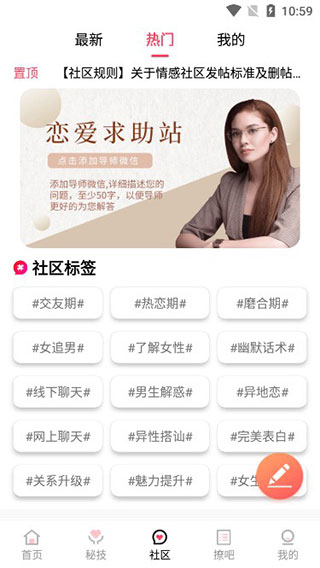 5、另外,用户也可在社区中选择好标签进行分享或者求助恋爱技巧;