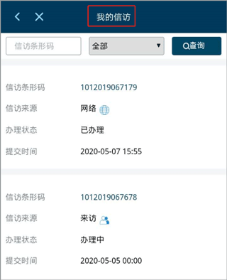 在“检察12309”APP“我的”中点击“我的信访”,可以查看通过来信、来访、来电以及网络提交的各类信访事项列表。