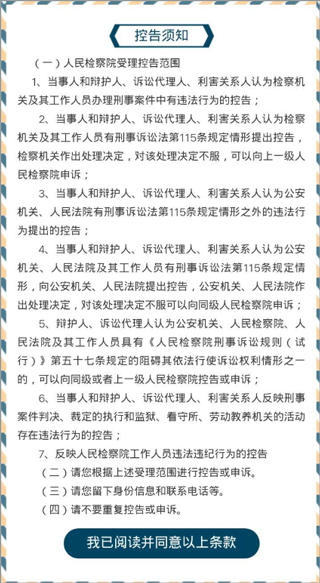 以”控告”为例,仔细阅读“控告须知”,确认无误后,点击“我已阅读并同意以上条款”。