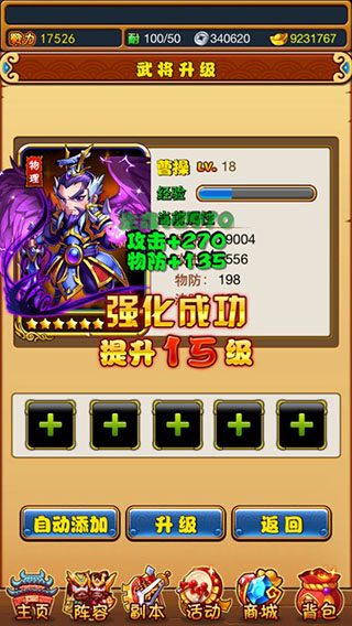 这里没有最强的武将,只有最合适的武将,只要悉心培养,每个武将都可以独占一面,武将有以下培养方式。武将升级:可以通过使用道具或者吞噬其他卡片获得经验,能提升武将的各个属性。可以使用自动添加功能,会优先使用武将卡片,武将卡片最高使用到3星的,其次是食物来升级。