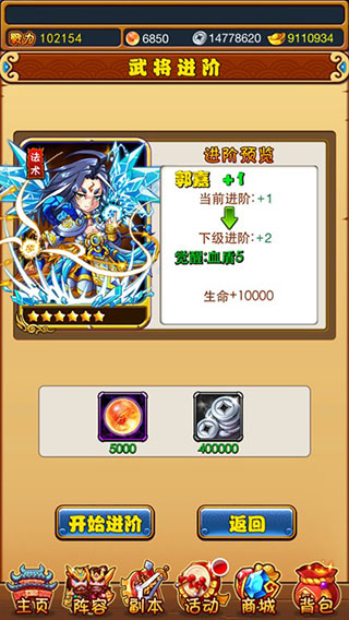 注:1、1-5级的进阶获得的是属性提升,6级进阶会升星,8级进阶会重新领悟技能。