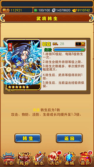 武将转生:当武将达到50级以后可以进行转生。每次转生可以提高5级的等级上限,满级可再次转生,能不断提高武将各个属性。武将转生时溢出的经验会自动用于转生后的升级。并且转生越多提升的幅度会越大。