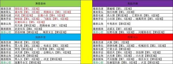 1、冒险的地图目前设定的比较简单,看地图名字和场景就知道去什么地方打什么材料啦