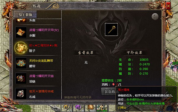 玩家等级达到2转后,就可以去收集魂之精石的材料,这种材料为红色晶石状态的道具,它是神秘的石头,似乎可以开发装备的潜在能力。玩家可以消耗魂之精石,在庄园-炼魂师处,为你身上的普通装备进行装备炼魂。