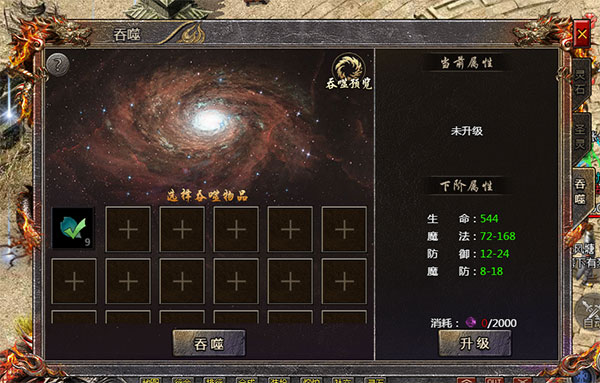 大家吞噬所得的【星辰碎片】,可用于切割源石来获取一些圣灵装备,而且还有机会获得一些【星云尘埃】的材料。玩家消耗这种材料,就能提升吞噬系统右侧的系统,来获得一些生命、魔法、防御、魔防的属性效果。