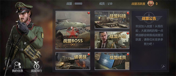 如图中所示,战盟界面分为战盟BOSS、战盟科技、战盟升级、破袭战、战盟成员。除此之外玩家还可通过左下角我的信息和战盟排行功能查询自己对于战盟的贡献值等内容。