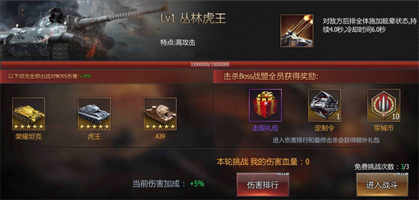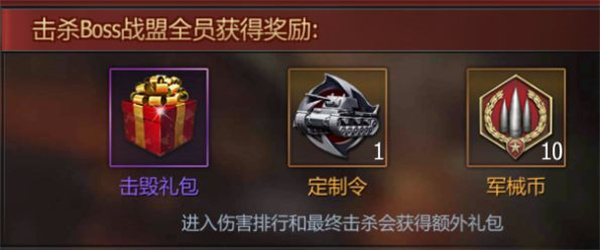 4、击杀BOSS后全员还能获得击毁礼包、定制令、军械币等道具,利用这些道具可以对于坦克进行有效的提升。
