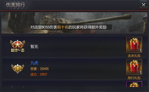3、除了自身对于BOSS的伤害奖励之外,玩家在整个公会成员内达到伤害占比前10还能获得额外的排名礼包。如果由某一个击杀掉BOSS,该名玩家还能领取击杀礼包一份!