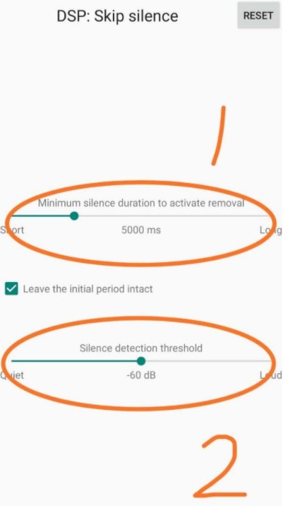 9、最后一个可调DSP,Skip Silence(跳过静音区域),红圈1处指定静音时间多长才跳过,单位毫秒,往左滑为短,往右滑为长;红圈2处标记静音检测的响亮值,往左滑安静,检测更灵敏,往右滑响亮,检测更宽松,根据自己播放音乐情况对应设置即可: