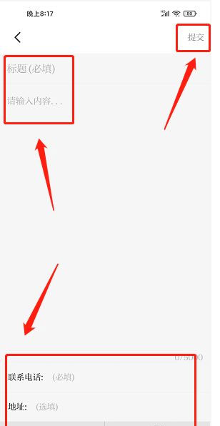 进入报料界面,输入报料标题、报料内容、联系电话、地址、上传图片、上传视频,点击【提交】。