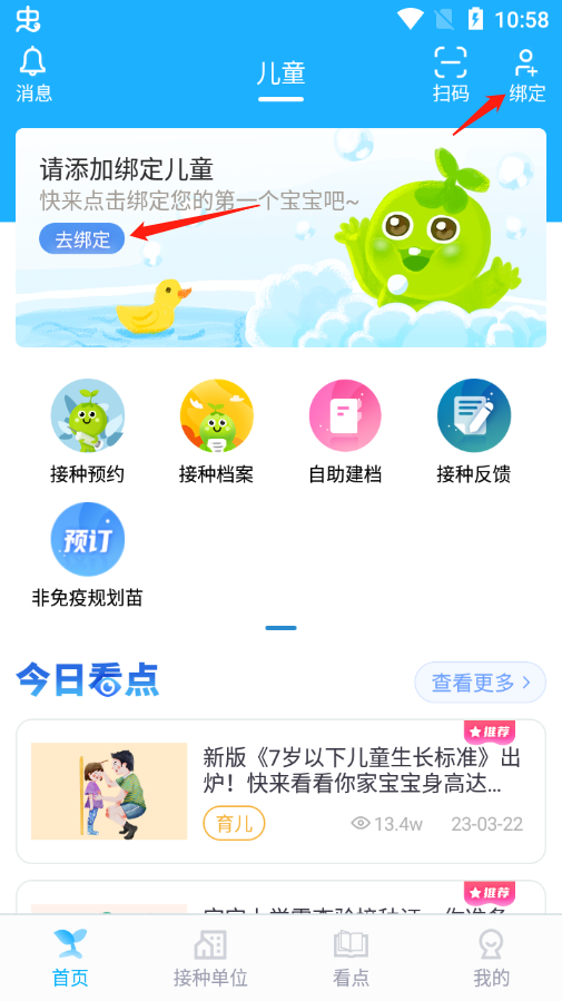 7、绑定好小孩信息以后,就可以点击【接种预约】进行预约疫苗。