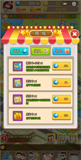 6、商城中有不同的道具,不同的道具有不同的作用,分别对应着抽卡、建筑升级等功能。玩家可以根据自己需要购买道具,通过提升人才的各方面的属性,可以极大加快赚钱的速度。