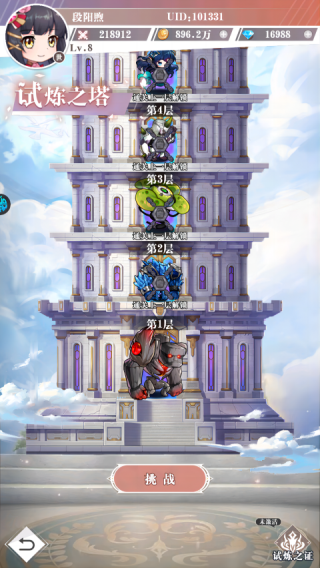 1、试炼之塔:爬塔玩法掉落大量晶石,还可以激活试炼之证,额外获得大量晶石。