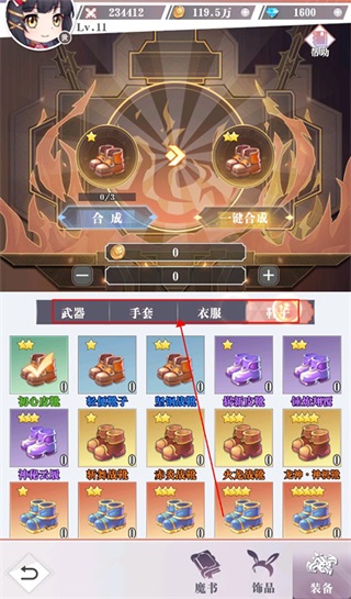 4、除了装备合成,玩家还可以点击下方的“饰品”和“魔书”进行装饰品和魔法书的合成升级。