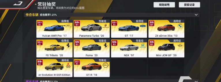 限时奖池得终极大奖是SS级赛车迈凯伦570S,除此之外,还有11辆传奇车辆、11辆稀有车辆和11辆普通车辆。其中抽到普通车辆的概率为87.68%,稀有车辆概率11.11%,抽到传奇车辆的概率仅为1.21%,不过有个好消息是当玩家抽到传奇车辆时,有25%的机会拿下迈凯伦570S。驾驭无界作为长期奖池,内含10辆传奇车辆,比如GT-R、NSX、Vulcan AMR Pro等都是性能非常好的赛车,稀有车辆13辆和普通车辆8辆。虽然普通车辆明显减少,但抽到不同品质的概率和限时奖池无差别。