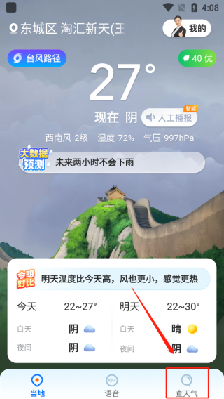 除此之外,软件还会根据天气情况给出穿衣建议、感冒风险预警以及户外运动的可行性分析,这些都让我觉得贴心又实用。对于经常因为天气突变而没带伞的人来说,这款软件简直是救星。而且它的操作也很简单,只需要按照步骤输入位置就能查到全国各地的天气情况。