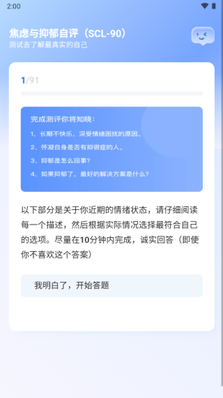 这个app还有其他特点哦,比如专门的交流论坛,可以和有类似困扰的人聊聊,挺好的。用法也很简单:选好测试类型→点开始答题→填完所有题目→查看结果。不过我要提醒大家,测试结果仅供参考,如果真的觉得不对劲,还是要及时去看医生。