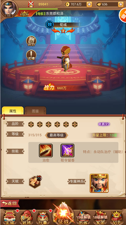 释放技能攻击敌方后排单体武将,并且无敌保护血量最少的队友,具有强大的保护能力。