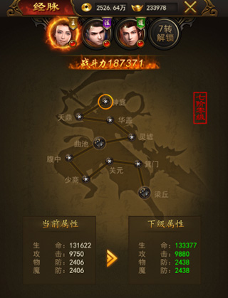 经脉系统可以增加玩家的生命、攻击、物防及魔防属性。游戏中玩家消耗真气丹可以激活经脉,并升级经脉的等阶与等级。