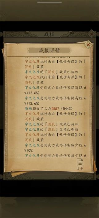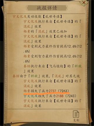 乱世奇谋:对自身外的敌我全体依次判定;若未混乱则有35%概率使其进入混乱状态,持续2回合;若友军已混乱时,清除其(主动和追击技能产生)负面状态,同时宇文化及为主将时,提高该友军造成伤害12%(释放技能的武将智力影响提高幅度),持续2回合;若敌军已混乱时,对其进行1次智力攻击,伤害系数175%。随后使敌军一人进入混乱状态。