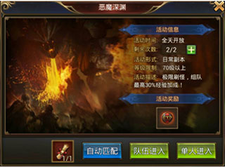 4、赏金任务每天必须完成,有大量的金币和经验;恶魔深渊更加是少不了(最好是在当天经验获得的任务都完成再打),它是经验获得最高的来源,建议组队一起打,有组队经验加成,同时最好能够进行鼓舞(如果是非R可以用金币鼓舞到50%,如果是土豪那么可以鼓舞到100%),经验丹也要吃(最好是2倍,没有的用1.5倍也行),打完恶魔深渊一般还要等3分钟左右才能再打下一次,这个时候可以去做一下单人副本或者直接挂机打怪,在经验丹的持续时间内把恶魔深渊都通关完。(当然啦,有钱的土豪可以提升vip等级增加购买次数)