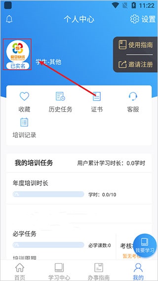 学员在“我的”页面【我的培训任务】可以看到当前需要完成的课程、考试等;