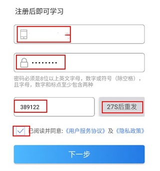 3、填写手机号码,密码,验证码(先获取验证码),勾选同意,点击下一步。