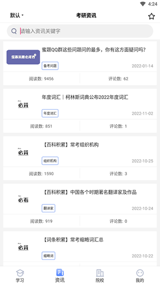 2、咨询界面有柯林斯年度词汇,百科积累,词条积累等学习信息