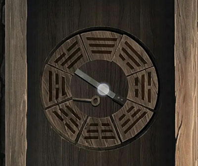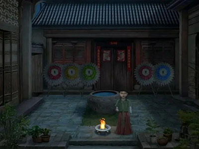 可以自由行动之后先看一下箱子的密码,提示是人头——纸人,花圈,马,小房子,注意这个小房子是有一个门和一个窗子的,所以我们观察纸房子时候找一下只有2楼的左右两边和3楼的右边满足,所以房子是3,然后数一下纸人8或9个,花圈3个,马1个,所以密码为8313或者9313,最后试一下是8313,打开拿到一张八卦卷轴和第二块八卦牌。
