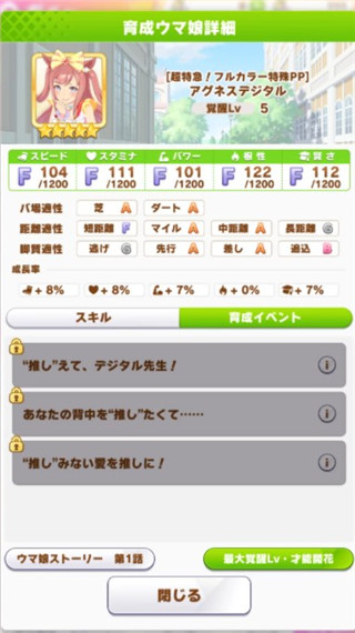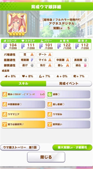 4、第三个隐藏事件名为“属于我的幸运星”,该事件对马娘的属性影响最明显。想要触发它需要马娘参加天皇赏秋以及有马纪念并夺冠,整体难度也不高但是对耐力有额外要求,建议学习至少两个金色回体技能求稳。