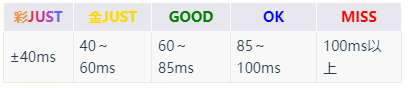 4、游戏对音符的判定共有5种,分别为彩JUST,金JUST,GOOD,OK与MISS。打出Miss时Combo会中断。五种判定的对应误差区间。