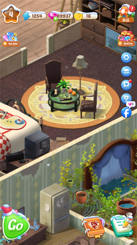 玩法很简单,点击GO开始消消乐模式,看看格子中的物品是否匹配需求,匹配后就能获得金币。通过合成升级不同的物品,达到一定金币后就可以前往场景进行维修或更换新家具,还能选择不同颜色装饰家园。