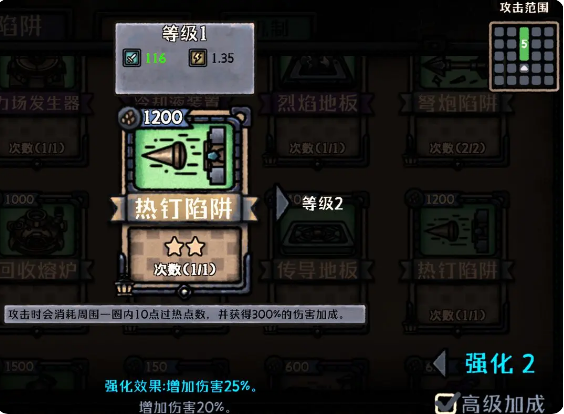 如果说前面的陷阱都是“小火慢烤”,那传导地板就是属于“大火炙烤”,低廉的价格打出超高的持续伤害,但是依然需要足够的“过热点数”作为触发效果的前提条件哦。