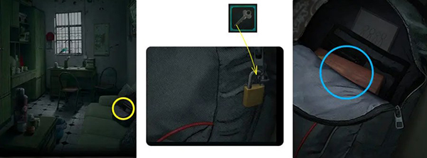 1、查看门前的包,拾取“充电宝”,并且根据线索得到密码“3521”,向于庶询问密码,用“充电宝”给手机充电。