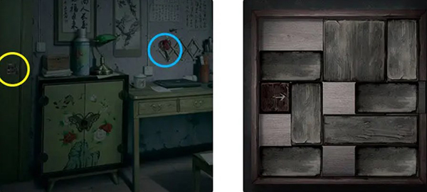 8、用“钥匙”打开401房门,拾取“剪刀”,将“积木”放入门锁机关,完成小游戏,进入卧室。