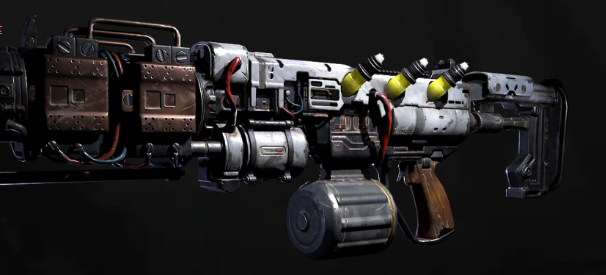 标准的军用级别机枪,枪身内利用了内置电磁导轨提高子弹射速可瞬间击穿厚重的金属护甲,但是因为极高的枪口动能和超重的体积,对使用该武器的人员的力量要求极高,也正因如此,该武器的使用者的手臂明显粗于常人数倍。