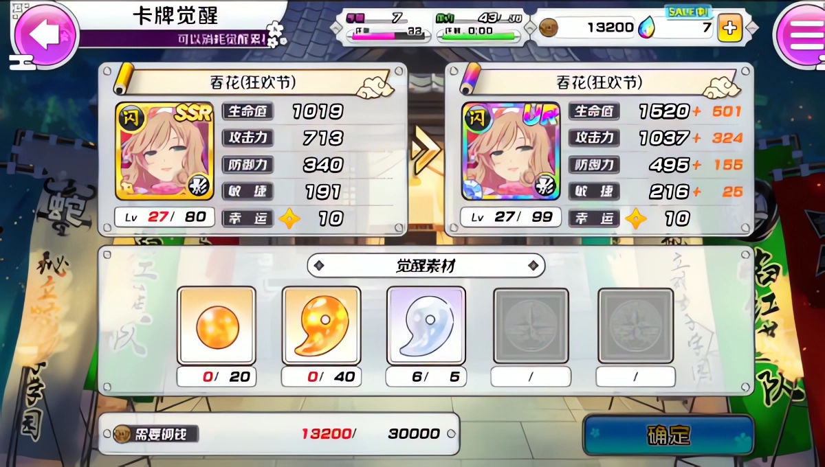 7、可以通过收集素材和觉醒材料来升级卡牌,值得一提的是这款游戏中最高等级的卡牌不是SSR而是UR,并且任何一款卡牌都可以升级至UR。