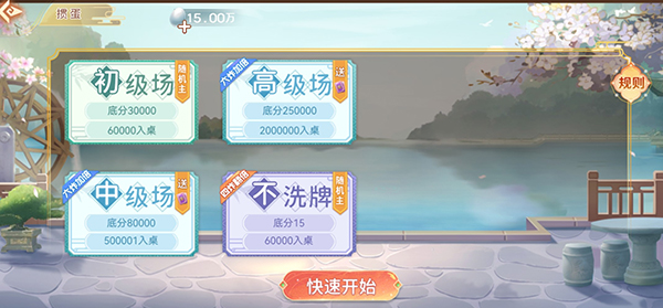 且在两种经典模式下涵盖初级场、高级场、中级场、不洗牌4种玩法,玩家可以根据自己的需求,以及银豆进行对局。