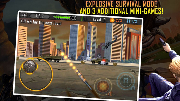 人类不会善罢甘休,他们会派出军队要来杀死你,所以你需要对空各种武器,比如坦克,飞机种类的,甚至到最后还会有外星人出现。