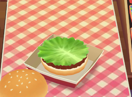 7、先将面包片放入餐盒中,将牛肉饼放到面包上,拖动生菜放到汉堡上。玩家可以随意放置肉饼和生菜的位置,点击沙拉酱在汉堡上长按滑动,美味的汉堡就做完了!成功解锁新食谱,牛肉汉堡。
