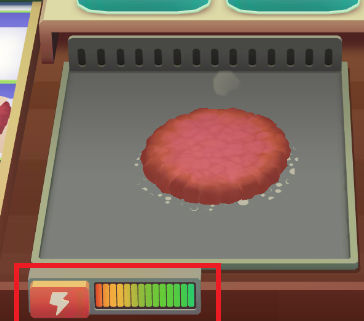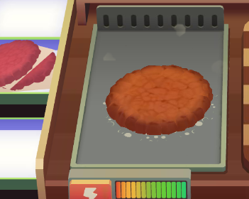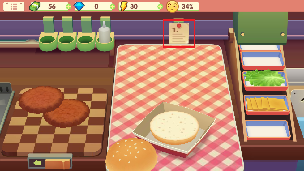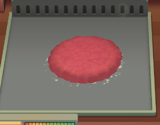 3、将肉饼放到铁板上烤熟,食材会占用对应的面积,记得好好利用空间,拖动汉堡到白色区域,白色区域为可放置区域,红色区域为不可放置的区域。