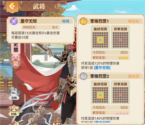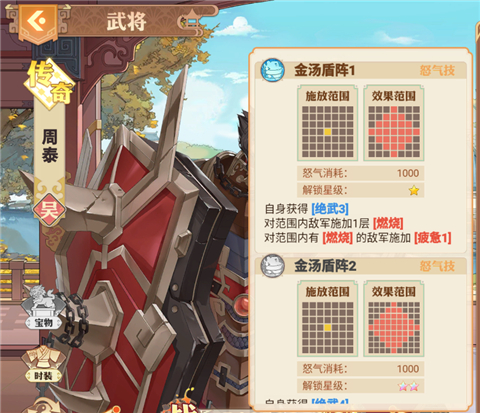 看到周泰拿个盾想必大家也知道他属于肉盾了,周泰的作用主要放在前面挨揍,为什么这么说呢,首先周泰在释放怒气技的时候可以增加自身物攻抗性,受到攻击时,可以给对方施加燃烧,且怒气技的效果范围极大,对于在效果范围内的敌军不仅可以施加燃烧,并且已经有燃烧的敌军还会受到物攻强度的负面效果下降。