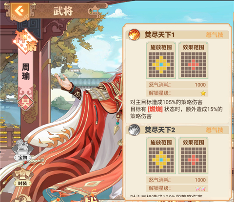 周瑜达到彩一星,在主攻攻击目标的时候,会在地上铺上一个火球,在这个火球上行动开始和结束的目标都会受到2层燃烧。总的来说周瑜的技能也是以给目标上燃烧为主,并且对有燃烧的产生额外伤害。